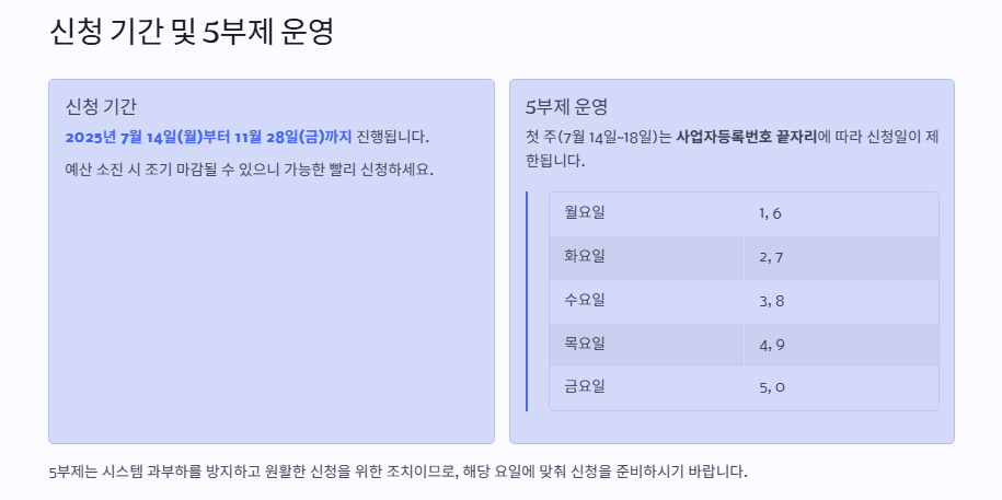 A: 2025년 7월 14일부터 7월 18일까지 사업자등록번호 끝자리에 맞춰 요일별 신청이 가능합니다.